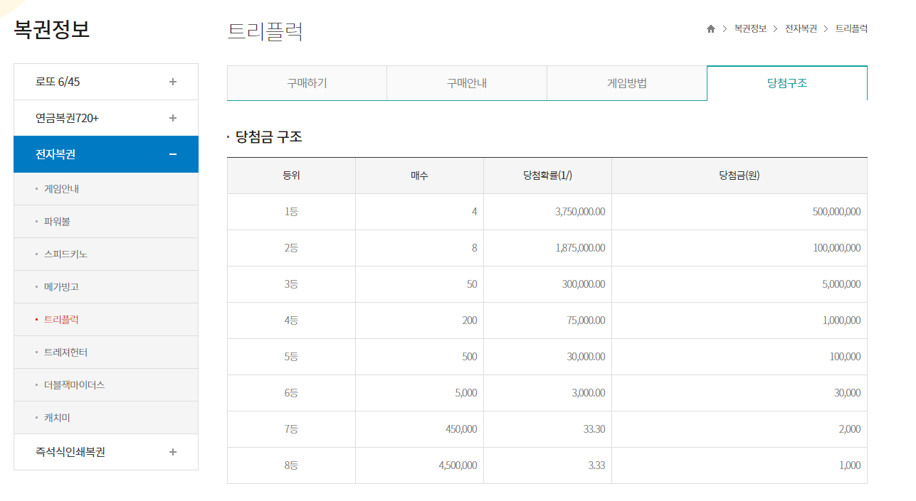 사실 저 트리플럭 두장을 사기 전에, 오늘의 구매액을 보면 알겠지만 일반로또 5천원, 연금복권5천원을 구매했었다. 아쉽게도 그건 다 안됐지만 그건 될놈될이려니 싶다 ㅎㅎ