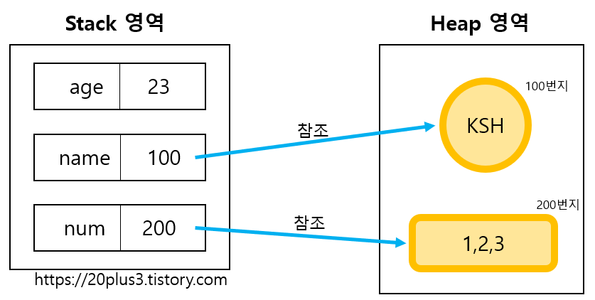변수 age는 기본타입이므로 heap영역에 참조할 객체가 생성되지 않는다. 반면에 name과 num은 참조타입변수이기 때문에 변수가 가진 값은 주소 값인 100, 200이다. 그리고 그 주소를 이용해서 heap 영역에 생성된 객체를 참조해 객체에 저장된 값을 활용할 수 있게 된다.