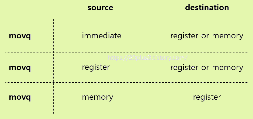 레지스터 역시 하드웨어인데 어떻게 데이터를 주고받을까? 바로 movq 명령어를 이용하는 방법이 있다. 기본 형식은 다음과 같다.