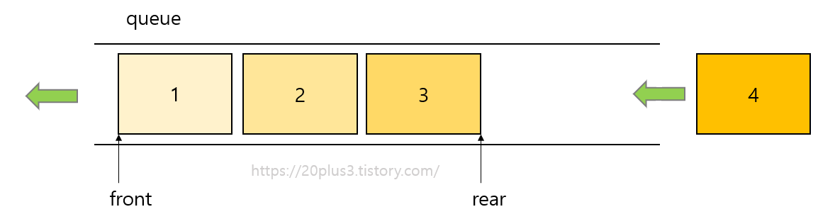 큐는 First in First out으로 선입선출의 구조를 갖는다. 아래 그림을 보면 스택에는 top과는 달리 front와 rear가 존재한다. 각각 가장 앞의 값과 마지막 값을 가리킨다.