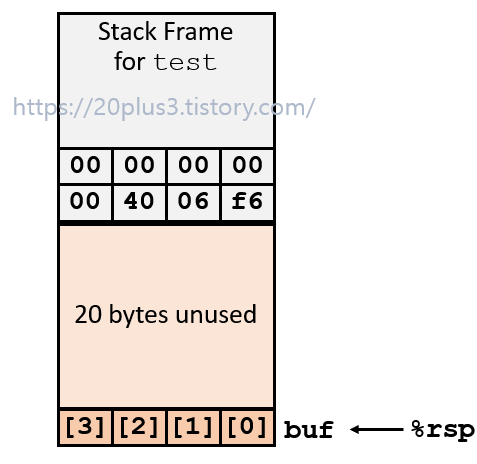 gets()를 호출하면 당연히 test()로 돌아올 수 있도록 return address가 있어야한다. 만일 return address가 4006f6이라면 아래와 같이 8byte가 채워진 스택이 될 것이다. (참고로 스택은 little endian 방식으로 채워진다.)
