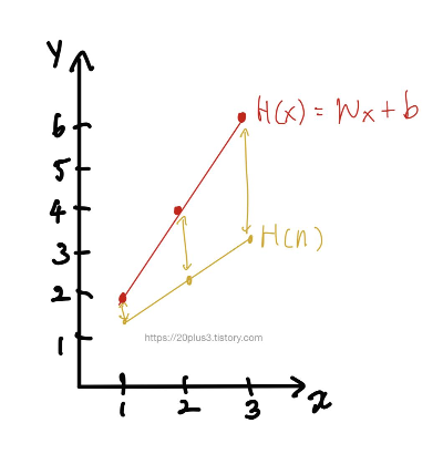 여기서 H(x)는 가설을 의미하며, 위 데이터 셋으로부터 나올 수 있는 가장 이상적인 가설이다. 그러나 어떠한 연유로 H(n)과 같이 이상적이지 않은 결과 값이 나오는 가설이 만들어질수도 있다. 이때 가설과 실제값 간의 차이가 존재하는데 이를 구하는 방법을 cost function이라고 한다. 가장 기본적인 함수의 형태는 다음과 같다.