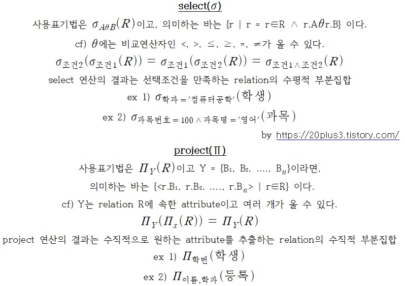 DB에 데이터를 저장한 후 사용을 하려 할 때 다들 멈칫할 것이다. 내가 필요한 데이터는 이 정도뿐인데 DB에 저장된 데이터는 방대하기 때문이다. 그래서 생긴 것이 관계 데이터 연산을 위한 관계 데이터 언어인 '관계대수'라는 것이다. 관계 데이터 언어는 정형어로써 절차 언어인 관계대수와, 비절차 언어인 관계해석으로 구분된다. 우리가 조명할 관계대수는 일반 집합 연산자와 순수 관계 연산자로 구분되는데 말 그대로 일반 집합 연산자는 집합에, 순수 관계 연산자는 관계에 적용된다. 참고로 절차언어라는 의미는 how와 what을 명세하고, 비절차적 언어는 what만 명세한다.